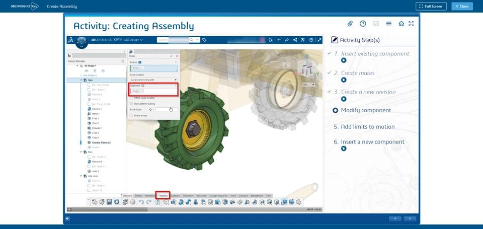 I am following along with the 3D Innovator course work and I am stuck on a step. The instruction video shows scaling the wheel with a scale tool in the features section. This tool allows the instructor to select origin as a reference and there is no selection for a surface or volume output. I do not have a scale tool in my features bar, but I do have one in the transform menu. In the picture below, it can be seen that there is no scale tool in the features menu. The multi output dialog box is