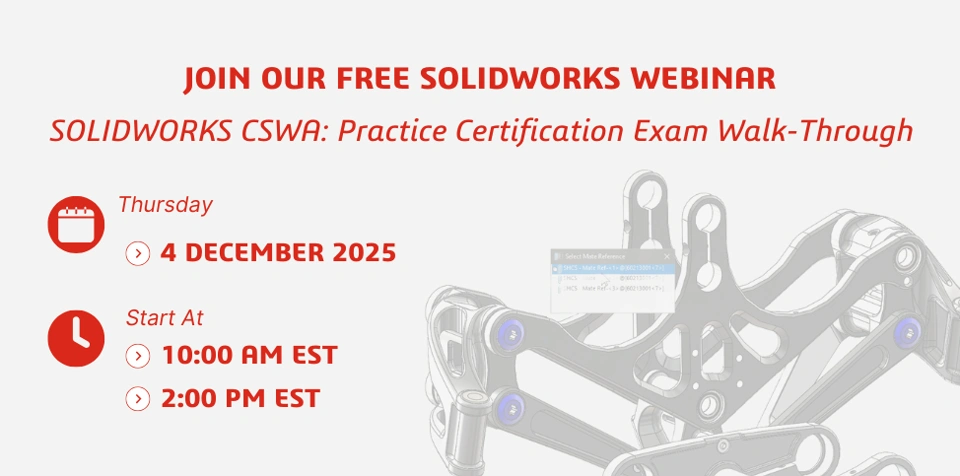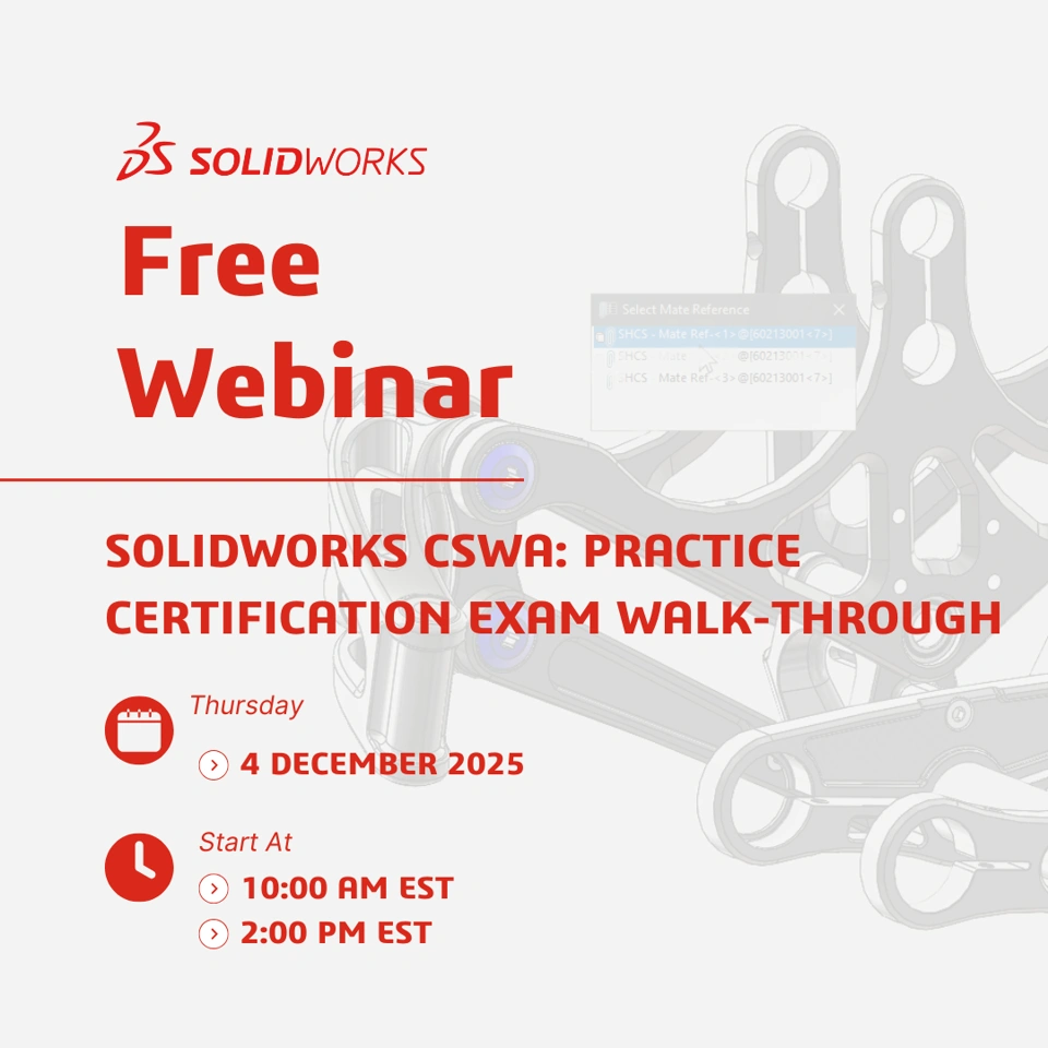 We heard you! 🙌 Our last certification webinar got such an amazing response… so we’re bringing you another one 👀 This session is all about the CSWA Practice Exam — we’ll walk through real sample questions, break down common mistakes, and share time-saving modeling tips to help you pass with confidence. Plus: we’re giving away FREE SOLIDWORKS certification vouchers to attendees 🎉 Have questions? We’ll answer them live. If the CSWA is on your radar, you don’t want to miss this. Choose the time