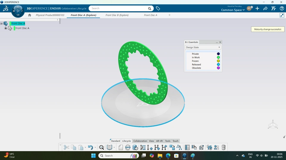 Changing maturity of a part I have started the 3D experience engineer certificate program in CATIA. I am working on the latest 2026 version that came a few days ago. However, the training modules are of the version 2025. I am stuck in the Create Parametric design module. I saw how to change maturity. When I do it myself (from in-work to frozen) a dialog pops-up that the maturity has been changed. However, when I check the BI essentials tool, the disc always appears to be green suggesting that