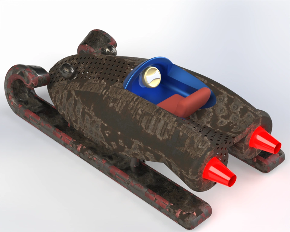I am sharing my latest CAD/Rendering model: a sleigh that serves as a study in contrast and a reflection on the passage of time. Technically, it screams opulence and fantasy: Lighting: Integrated LED lights, symbolizing the initial brilliance of dreams. Comfort: A seat upholstered in luxurious red velvet, echoing the comfort and wonder of childhood. Detail: An anodized blue cockpit, a modern touch of technical perfection. However, all this beauty is tragically overshadowed by a body degraded by