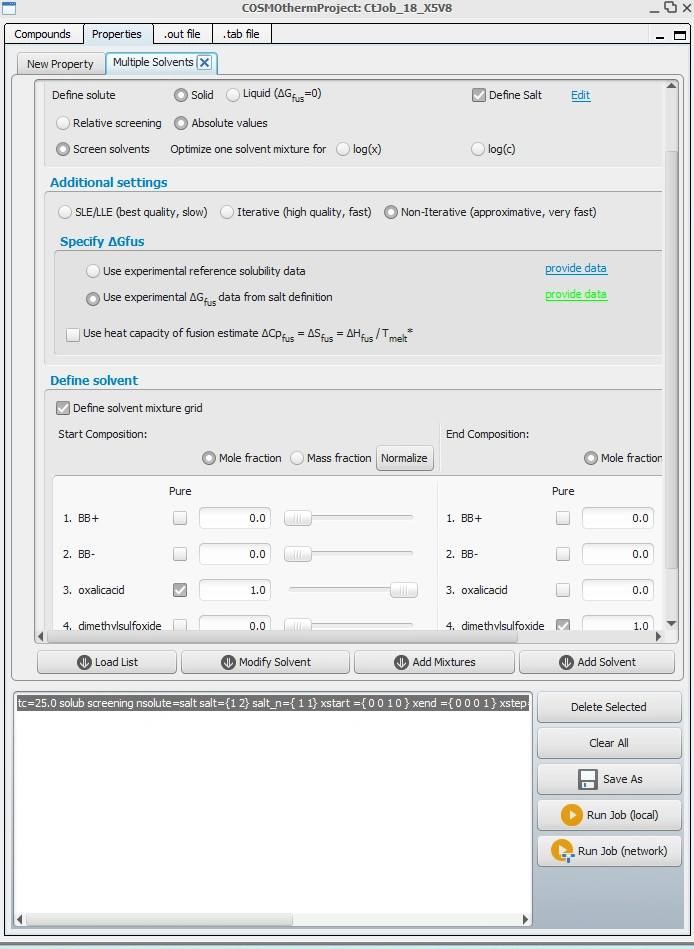 Dear Professors, Hello everyone! I am a beginner in using COSMOtherm X and would like to verify whether my solubility calculations are correct. I would greatly appreciate your guidance and corrections. The solute I am working with is a quaternary ammonium salt compound. For the calculation, I uploaded its cation and anion structures. The solvents I selected are oxalic acid and dimethyl sulfoxide (DMSO). My procedure was as follows: Navigated to Properties → Multiple Solvents. Configured the