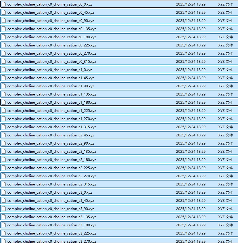 Dear all, I am currently working on constructing a dimer structure for choline chloride (a quaternary ammonium salt), as illustrated in Figure 1. fig 1 the structure of choline chloride. Following advice, I first created an initial guess for the dimer geometry (Figure 2) in order to generate .xyz coordinate files for the choline chloride system. These files are intended to be used as inputs for further