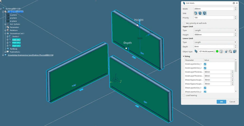 Description Wall Objects can be used with Building 3D Design to convert low-level wall features into higher-level wall features. These features can then be converted to an even higher-detailed product assembly structure. Parameters / OutputsNote: Parameters will slightly vary depending on the wall object-type selected How Its Used / Image Gallery Create desired walls using the "Wall" function in Building 3D Design Shift-select the desired walls then select "Multi-Edit Wall" Beside the