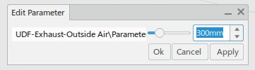 Exhaust-Outside Air Pictures Features Embedded in Part Size: Select the opening size of the louvre Depth: Configure the depth of the louvre, minimum depth is 100mm and maximum is 1000mm Shape: Configure the shape of the louvre Visibility: Change the visibility of elements between the 3D and 2D representations or both. 3DXML