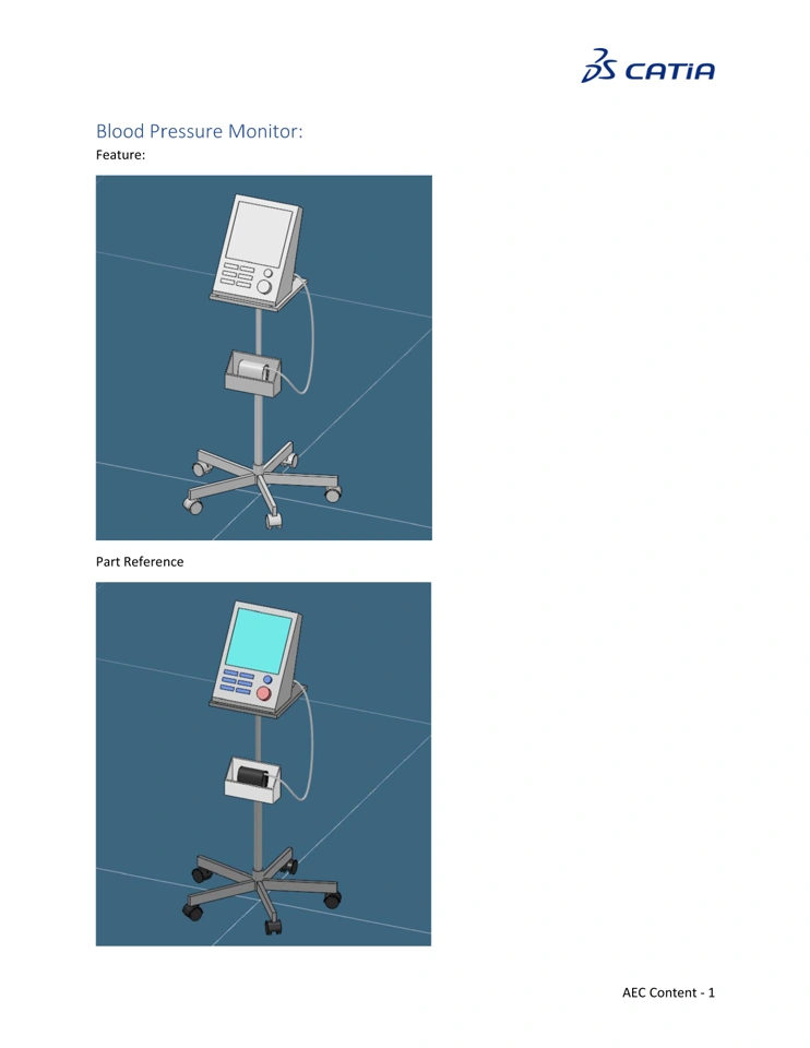 2026 Hospital content Equipment Reference Reference Image 3DXML: Object Type Name: OT-Hospital Equipment-Blood Pressure Monitor Documentation:Input Axis System: The input Axis System for the blood pressure monitor is at the base of the monitor, centered and positioned on the floor. X axis is pointing to the front of the monitor. Full Documentation in PDF