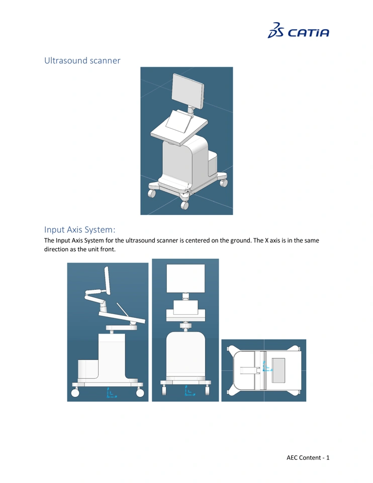 2026 Hospital content Equipment Reference Reference Image 3DXML: Object Type Name: OT-Hospital Equipment-Ultrasound Machine Documentation:Input Axis System: The Input Axis System for the ultrasound scanner is centered on the ground. The X axis is in the same direction as the unit front. Full Documentation in PDF: