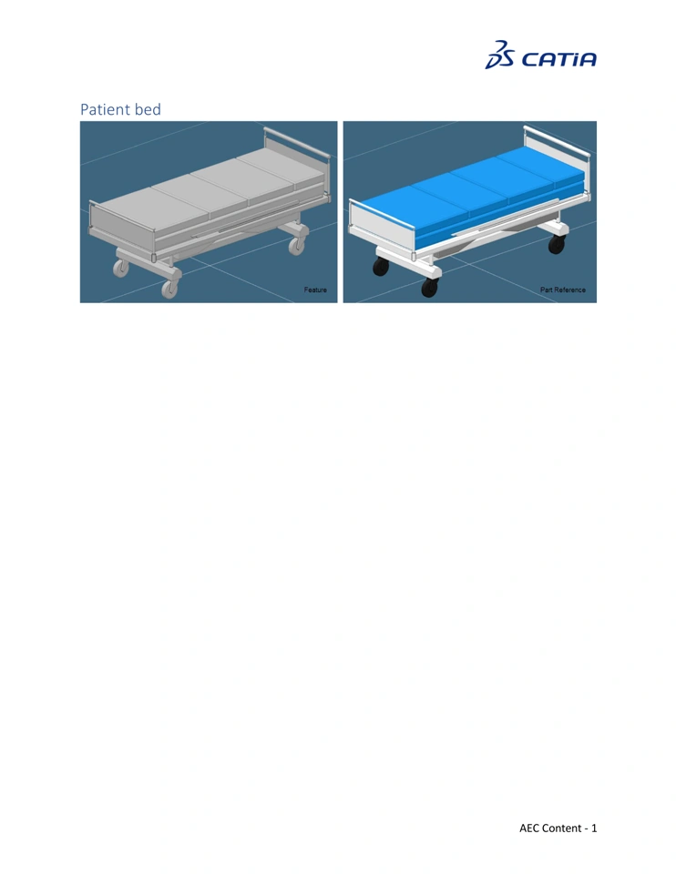 2026 Hospital content Furniture Reference Reference Image 3DXML: Object Type Name: OT-Hospital Furniture-Patient Bed Documentation:Input Axis System: The Input Axis System for the patient bed is centered on the patient head end. The X axis is in the same direction as the unit front. Configurations: Railings No Railings Full Documentation in PDF: