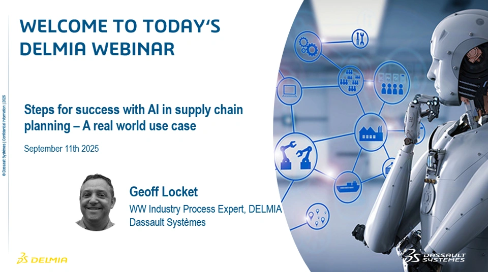 Watch the replay of our expert-led session on the cutting-edge intersection of Artificial Intelligence and Supply Chain Planning. This is your opportunity to learn from Geoff LOCKET, DELMIA Worldwide Industry Process Consultant, as he shares his expertise on crafting AI solutions that deliver measurable impact.
