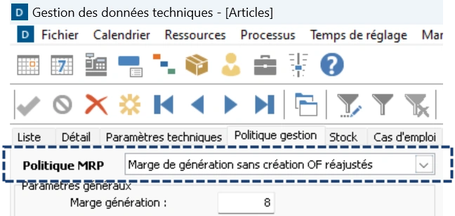 Avec DELMIA Ortems 2026, il est désormais possible d'empêcher la création d'Ordres de Fabrication (OF) réajustés de composants pour les articles composés lors du calcul SRP. Cette fonctionnalité, également appelée 'Mode SP', peut être activée au niveau des composants Semi-Finis (SF) sous la forme d'une nouvelle politique de gestion. Cette nouvelle configuration est spécifiquement réservée aux SF. 1/ Nouvelle politique MRPLa politique « Marge de génération sans création OF