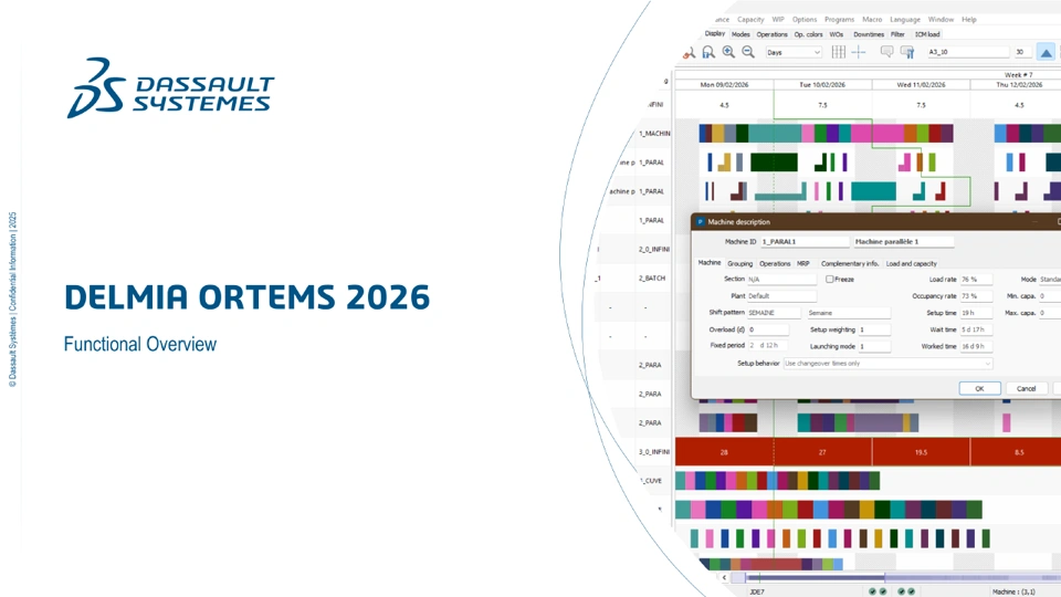 On November 7, 2025, DELMIA Ortems 2026 became generally available for customer ordering and delivery. This release offers several new capabilities and enhancements: Activate potential operations for parameter cycles. Perform SRP calculations without generating adjusted work orders. Customize the scheduling fixed period for each machine. View and manage stock orders in the machine Gantt chart. Undo declaring an operation in progress. Create stock orders in collaborative mode. Detect stored