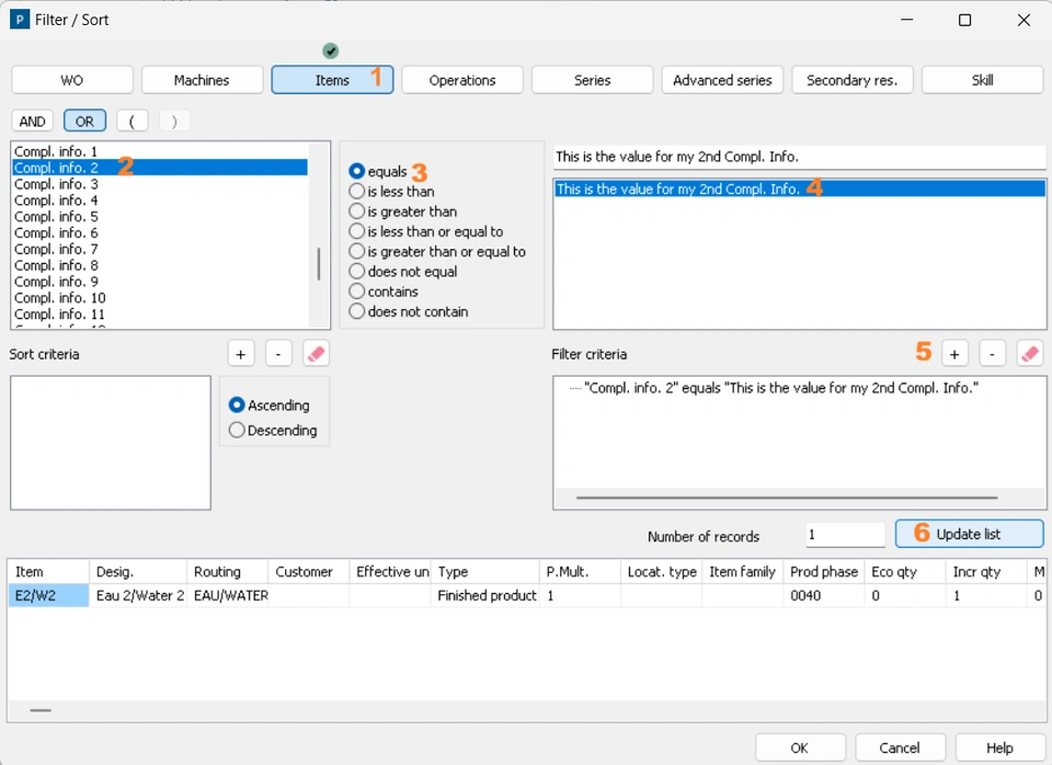 DELMIA Ortems R2025 Refresh6 extended the filter ability of ‘COMPLEMENTARY INFORMATION’ char fields to Items, Machines and Series