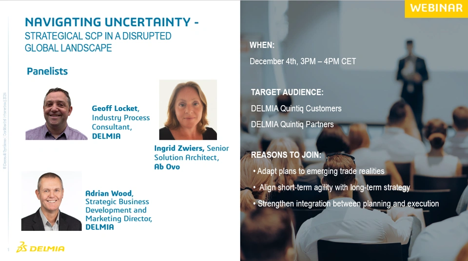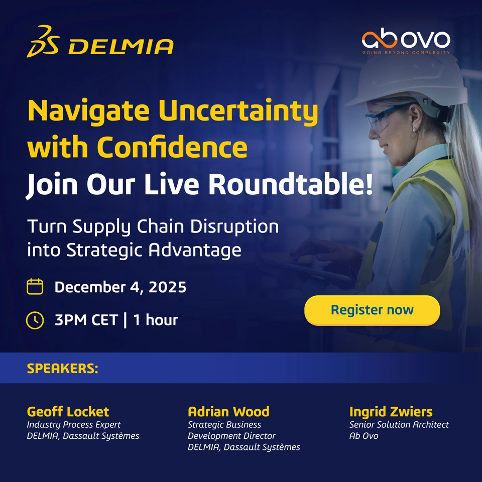 Don't forget to register for our live online panel discussion about Strategic Supply Chain Planning in a Disrupted World if you haven't, yet. On December 4th, our DELMIA expert Geoff Locket and Ingrid Zwiers, from our strategic partner Ab Ovo, will unpack the economic forces impacting supply chain planning - from escalating input costs and demand volatility to tightening sustainability regulations. Join us and bring your ideas and questions for an interactive session.
