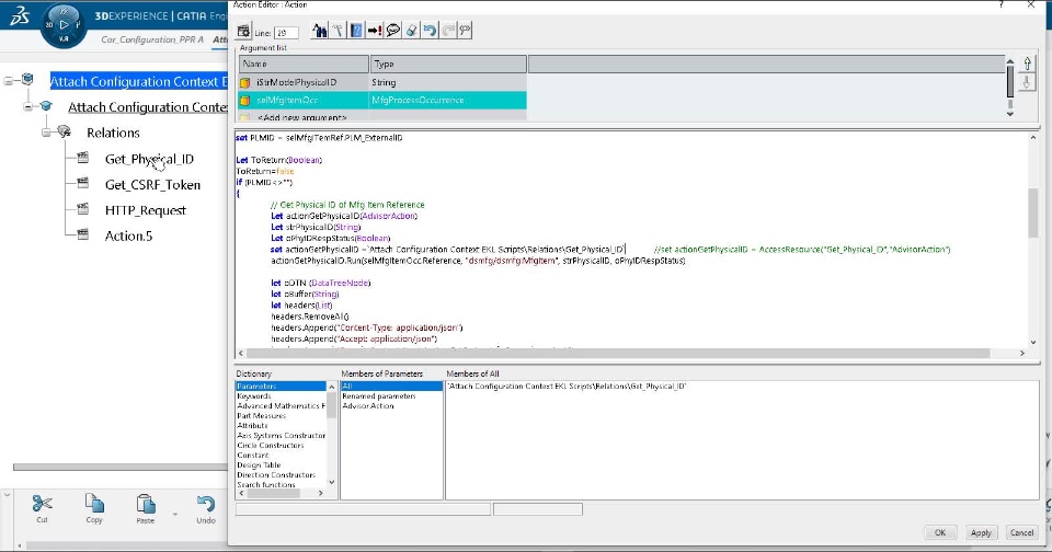 Introduction Whats new in 2025? The scripts now use the "GetPhysicalId" method to get the Physical ID of the objects instead of using web services. This makes the overall script simpler.Introduction This document intended to provide a detailed guide and examples on how to write EKL script to attach Configuration Context (Model dictionary) & criteria on Mfg. Item. Along with this there are example EKL actions to attach Configuration Context & criteria on Engineering Item, Resource and System.