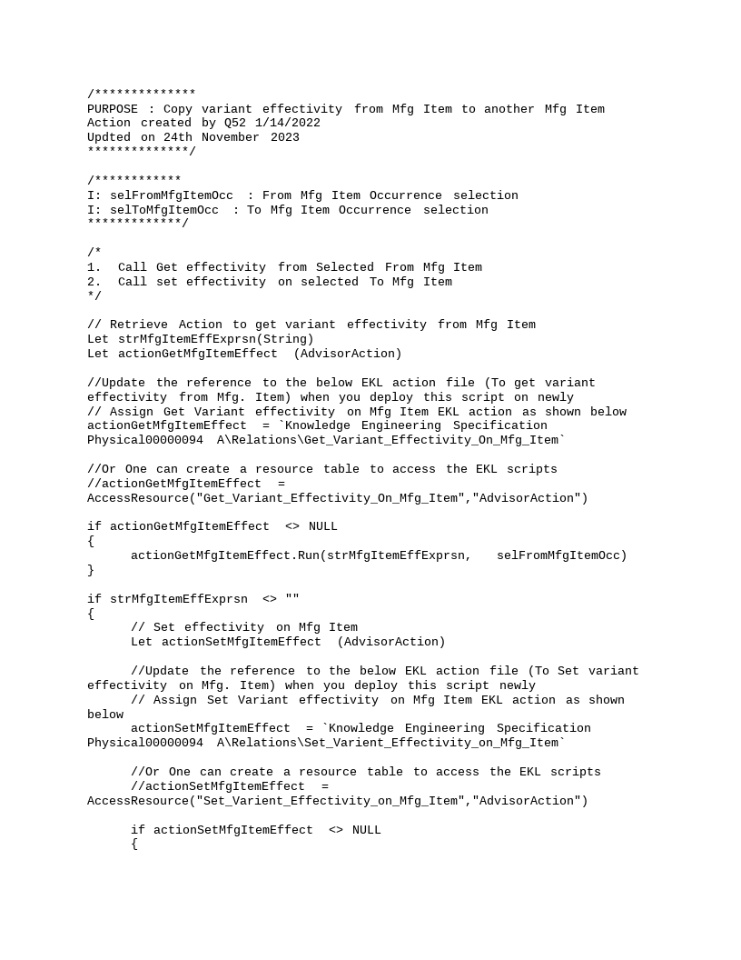 Introduction This document intended to provide a detailed guide and examples on how to write EKL script to copy variant effectivity from Eng. Item to Mfg. Item. Along with this there are example EKL actions to copy Model Dictionary from one Mfg. Item to another Mfg. Item. Version – 2026xGA (For older version of 3DEXPERIENCE platform check older version of this article) Pre-requisites Licenses –These EKL scripts call 3DSpace web services, which require specific licenses to execute as mentioned in