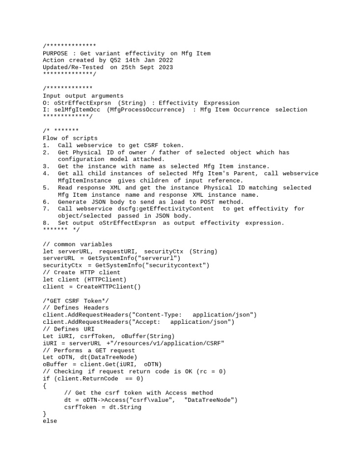 Introduction This document intended to provide a detailed guide and examples on how to write EKL script to get variant effectivity on Mfg. Item. Version – 2026xGA (For older version of 3DEXPERIENCE platform check older version of this article) Pre-requisites Licenses – These EKL scripts call 3DSpace web services, which require specific licenses to execute as mentioned in below table. (These are referred from developer documentation of web services) Mfg. Item related web services • MFN