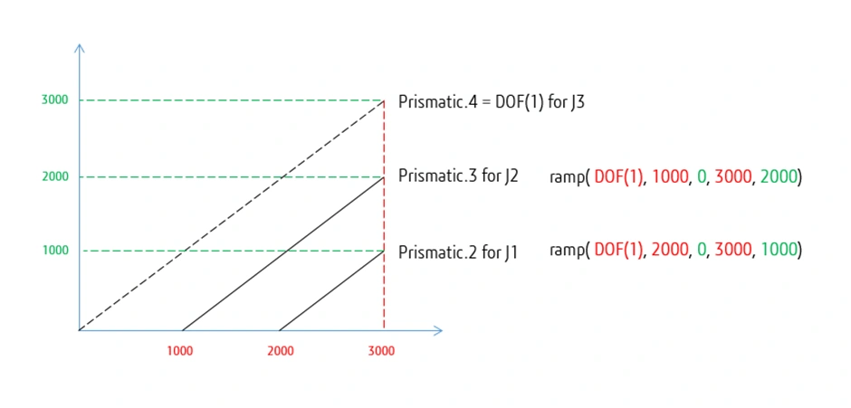 credit: @JK Hello. When you need to define kinematics for equipment with an extendable arm, such as lift cranes, using Kinematic Relations is one of the solutions. Here is the sample for using Kinematic Relations. J1, J2, J3 can extend each 1,000mm in this model. Finally J3 can extend to 3,000mm. For this, you can use the function, Ramp() in Kinematic Relations. When you search this in User Assistance, you can find this explanation. You can apply this to the sample model. After