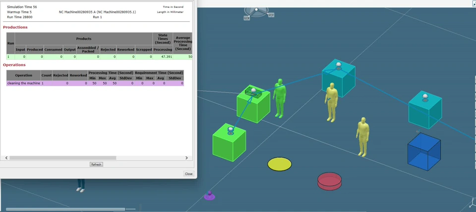 In the factory flow simulation, the material initially starts in the buffer and then moves to Machine 1 for processing. After the machining operation in Machine 1, the material flows to Machine 2 for the next stage of production. At the beginning of production, a cleaning operation is performed on Machine 1 before starting the first machining cycle. This cleaning activity is defined as a generic operation to ensure the machine is properly prepared for production. Once the initial cleaning is