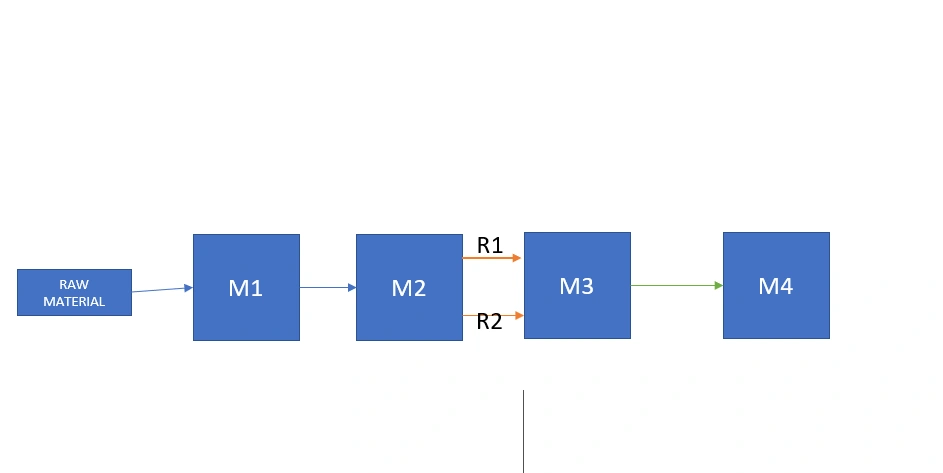 Factory Flow ScenarioThe raw material starts at the input zone and flows to Machine 1. Machine 1 processes the material and sends the output to Machine 2. Machine 2 begins processing and converts the input material into two separate parts, named R1 and R2. After processing, Machine 2 sends the first output, R1, to Machine 3 for further processing. Machine 3 can process only one part at a time. Once Machine 3 completes the processing of R1 and sends it forward, it then receives the second output,