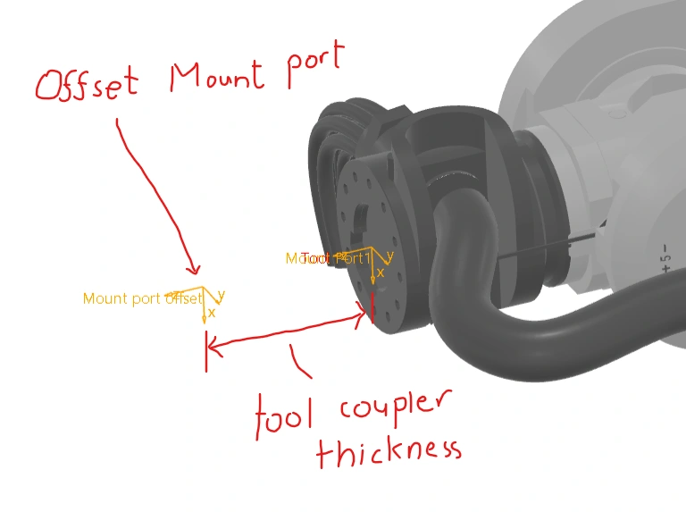 Hello members of this community, I wanted to check if it is permitted to create additional Mount Ports on robots to account for the thickness of tool adapters/couplers that attach to any robot mounted tool - be it grippers or welding guns, as shown below: We usually include this offset on the base port of the robot mounted tool itself so that it can be used with the default mount port. Will having an additional Mount port have any negative affect on the inverse kinematics in any way ?