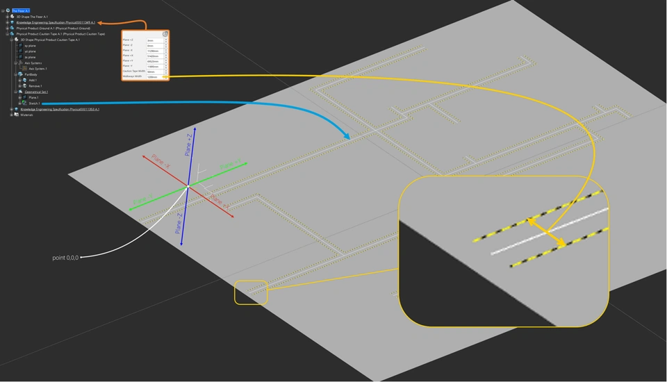 Are you working on a new factory layout? Do you want to update your demo with a realistic-looking floor? Is it hard to find a model that suits your needs? I have an answer to all these needs! With the parametric floor, you can easily adapt it to your factory layout in just a few clicks. What's more, you can simply create paths with caution tape between workcells by drawing lines in one sketch and the floor will automatically rebuild. How to use it?To modify overall geometry of the floor, use