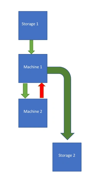 Hello everyone, I'm trying to simulate the following material flow in a factory flow simulation. I have two machines and two storage stations. The material flow is as follows: It starts from Storage Station 1, moves to Machine 1 for the first machining operation. After the operation is completed on Machine 1, it proceeds to Machine 2 for the next machining process. Once machining is completed on Machine 2, the material returns to Machine 1 for another machining operation. After the final