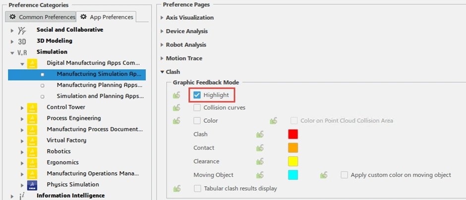 Hello. This is a simple tip about the preference for Clash. The default Graphic Feedback Mode for Clash is Highlight. When there is a clash, the clashed parts are highlighted. But when I make simulation videos, I sometimes want to make the videos more colorful for visualization. If we change the preference to Color and check on ‘Tabular clash results display’, the clashed parts are colored as defined in Preference and we can check the clashed parts in Dynamic Clash Results window.