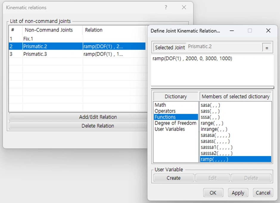 Hello. When you need to define kinematics for equipment with an extendable arm, such as lift cranes, using Kinematic Relations is one of the solutions. Here is the sample for using Kinematic Relations. J1, J2, J3 can extend each 1,000mm in this model. Finally J3 can extend to 3,000mm. For this, you can use the function, Ramp() in Kinematic Relations. When you search this in User Assistance, you can find this explanation. You can apply this to the sample model. After defining prismatic