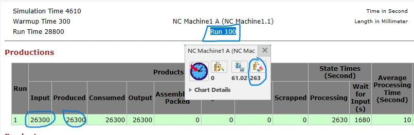 When I generate the factory flow statistics report for a particular machine, the actual input is 263, but in the report, it shows 23,000 products as input — which is 100 times higher. I think this issue is because the “Run = 100” option at the top of the report is multiplying the count. However, I don’t know how to change this value. I want the report to display the actual input data.
