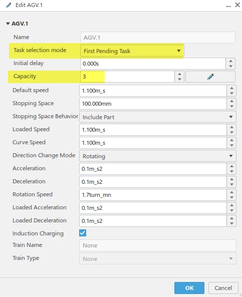 Hello. This is a tip for AGV delivering multi parts. This is an example scenario : There are two kinds of products, MP_Big and MP_Small. Because MP_Big is big, the AGV can pick up only 1 MP_Big at DZ1 and drop it off at DZ6. And, because MP_Small is small, the AGV can pick up 3 MP_Small at DZ2 and drop off one by one at DZ3, DZ4, and DZ5 cyclically. 1. For this scenario, first we need to set up Task selection mode = First Pending Task and Capacity = 3. But, with these settings, the AGV can