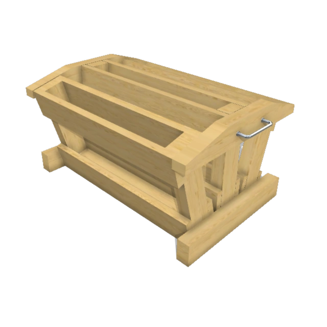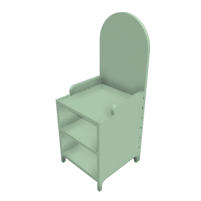 Station de lavage montessori pour enfants. Une bassine sur le dessus en guise de vasque, un crochet sur le côté pour un essui-main et un miroir sur la partie arrondi pour permettre de se laver mains, visage et dents et de se coiffer.