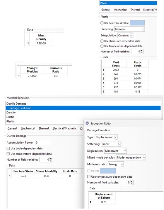 Does anyone know why my dependencies aren't working here in this snippet of my .inp file: My elasticities are intentionally the same but I am not able to get damage initiation to work with my dependency. *Material, name=MAT_1 *DENSITY 2962.01, *ELASTIC, TYPE=ENGINEERING CONSTANTS, dependencies=1 1.4425e+10, 1.4425e+10, 2.9083e+10, 0.397, 0.191, 0.191, 5.2349e+09, 7.9106e+09 7.9106e+09, -0.33 1.4425e+10, 1.4425e+10, 2.9083e+10, 0.397, 0.191, 0.191, 5.2349e+09, 7.9106e+09 7.9106e+09, 0.33