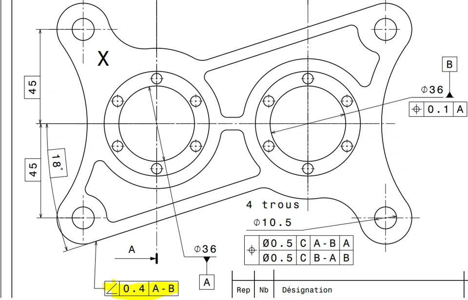 I need to apply an Angularity tolerance (\\\$\\angle\\\$) of 0.4 to a planar face, relative to a central axis (A-B Datum), as shown on my 2D drawing. The face is inclined at 18°.