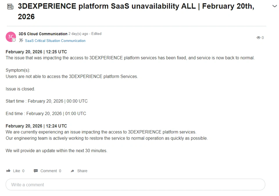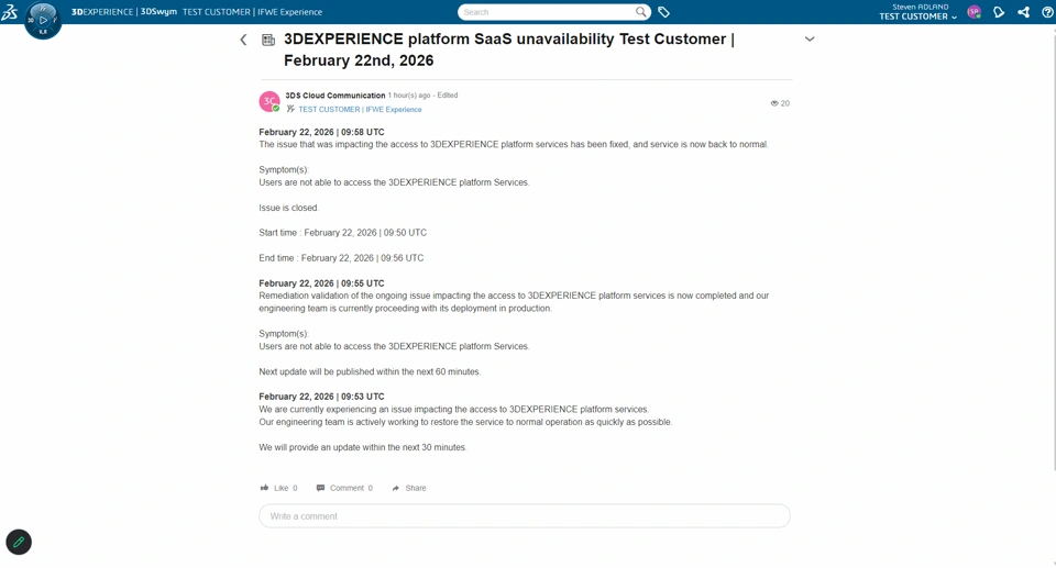- Give more visibility on the progress of ongoing 3DEXPERIENCE platform unavailability through 3DSwym Posts