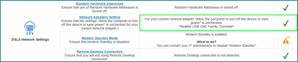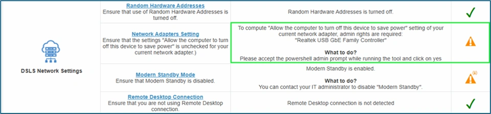 As part of the recent fix, the Network Adapter power-saving setting check has been updated.