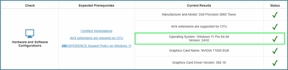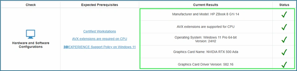 In recent times, multiple workstations has been certified by the Dassault Systèmes for supporting the 3DEXPERIENCE® Platform on the Cloud. All of these workstations are updated into Certified Workstations List for 3DEXPERIENCE® Platform on the Cloud and the Cloud Eligibility Checker tool does take these changes into account in Hardware and Software Configurations check as per below: