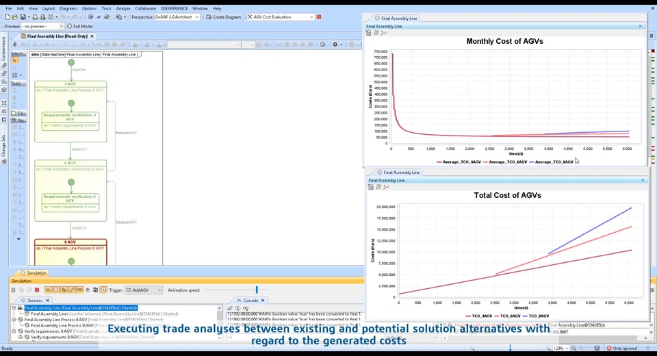 Here, we will assess the performance of the existing assembly process, which uses 4 Automated Guided Vehicles (AGVs), to determine whether the current solution can meet the newly derived requirements for FAL in relation to the new program. From there, we will go a step further and begin developing alternative solutions, such as configurations using 6 or 8 AGVs🚛🤖 We will then conduct trade analyses to compare these potential alternatives with the current solution. By doing so, we can evaluate different solution scenarios and identify the most viable option, supporting the OEM in making informed decisions for the new setup of the FAL for the new program