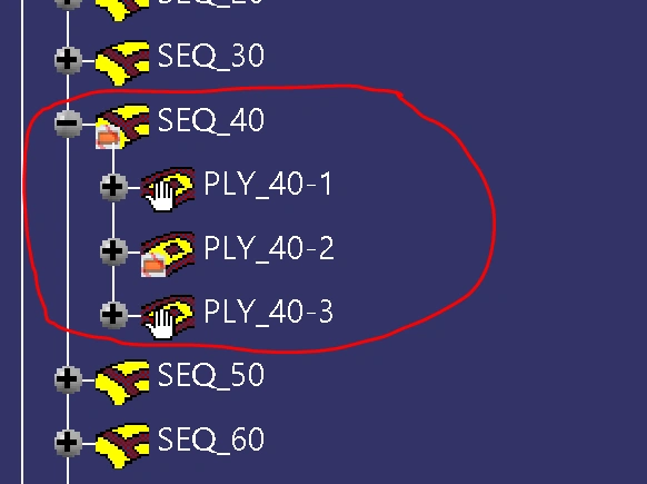 I noticed that in the specification tree, PLY_40-2 has a different symbol than the rest, maybe a warning or error symbol. Can someone please explain what this means?