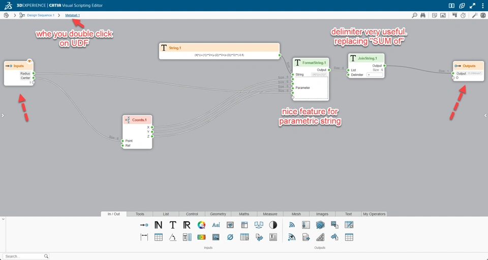the user operator of the metaball the center and a radius in input and then outputs the formula of the metaball. it will be taken by the "mesh from equation" function.