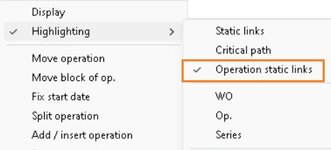 “Highlighting > Operation static links” highlights only the operations directly linked to the selected operation (whatever the links are originating from and arriving at the selected operation). This differs from “Highlighting > Static links” that propagates the highlight to the successors of the successors of the selected operation.