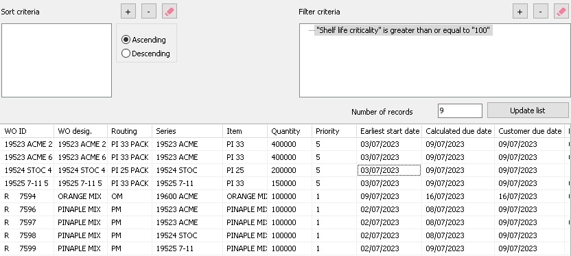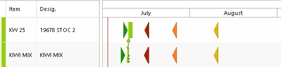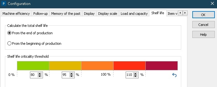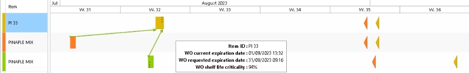If you face any conflict you will have a new WO color to highlight the criticality of the shelf life including pre-alert system. 100% being a kind of risky just in time, below 100%, customer request is fulfilled, above 100, the planning doesn't match customer shelf life request.