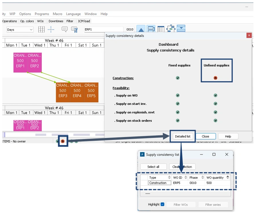 Double-clicking on this icon enables accessing more information and the 'Detailed list' button highlights the Work Orders associated with these unresolved supplies.