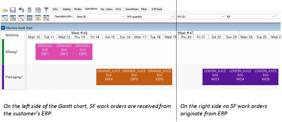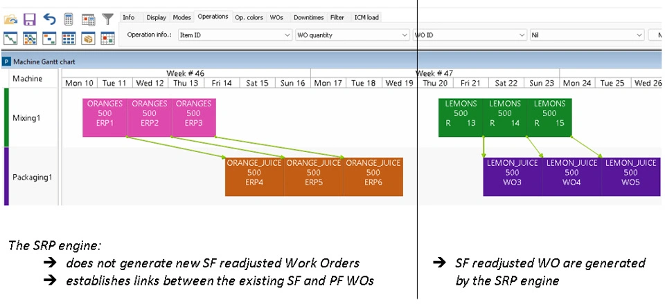 This policy prioritizes the integration of current semi-finished (SF) items WOs with finished product (FP) or SF WOs in the planning during the SRP phase. This is particularly beneficial when customers manage their Materials Requirements Planning (MRP) through their Enterprise Resource Planning (ERP) system, rather than through Ortems.