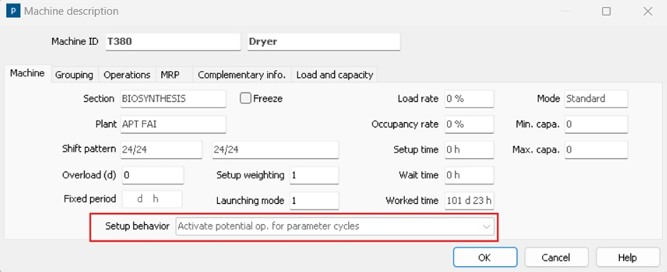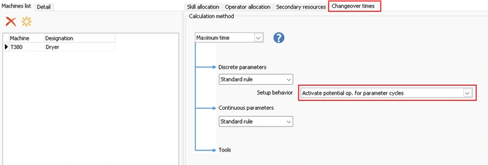 - In Data Module via Resources > Machine groupings, in ‘Changeover times’ tab: select ‘Activate potential op. for parameter cycles’ for Setup behavior.
