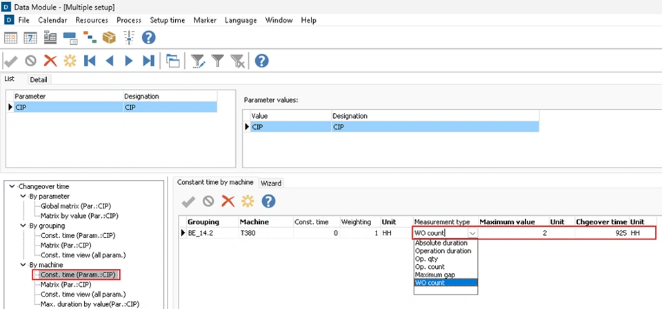 Here is the configuration in Data Module application: open ‘Setup time’ > ‘Discrete parameters’ menu: Define the calculation method as 'Const. time' in Changeover time > By machine.