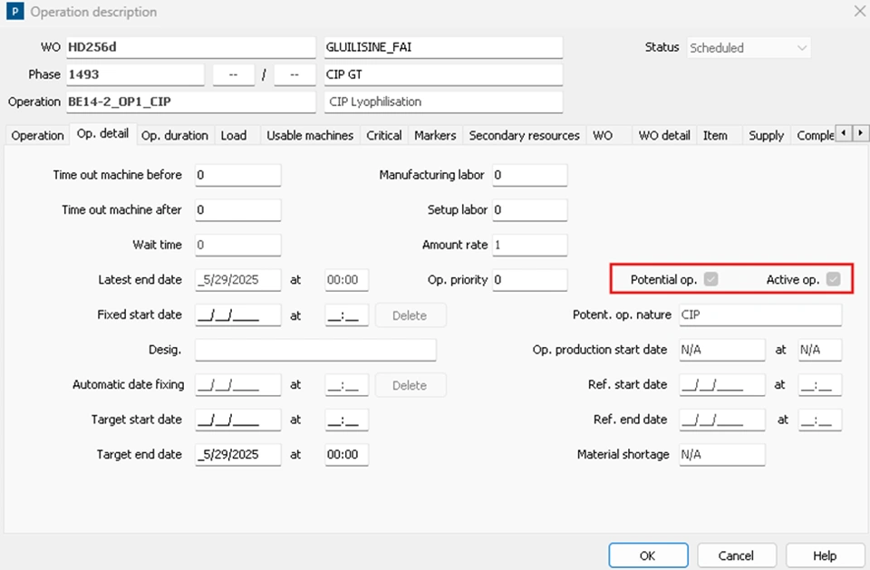 According to the rule above, a potential operation is activated as soon as 2 different WOs are executed (i.e. operations belonging to 2 different WOs). The second potential operation is activated once the 2 WOs were planned: ‘HD263d’ then ‘HD264d’ (even if the next WO is the same ‘HD264d’, the potential operation is immediately activated after these first 2 distinct WOs).
