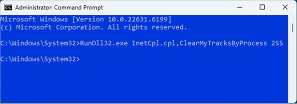 At the command prompt, input this string RunDll32.exe InetCpl.cpl,ClearMyTracksByProcess 255 and press ENTER