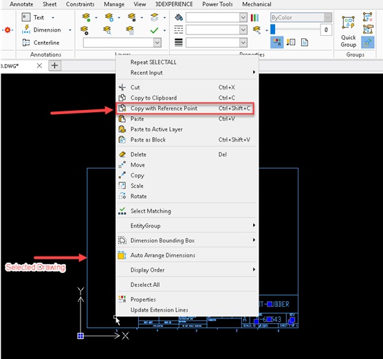 b. Right click on the selected Drawing, select ‘Copy with Reference Point’ and specify a reference point of the drawing.