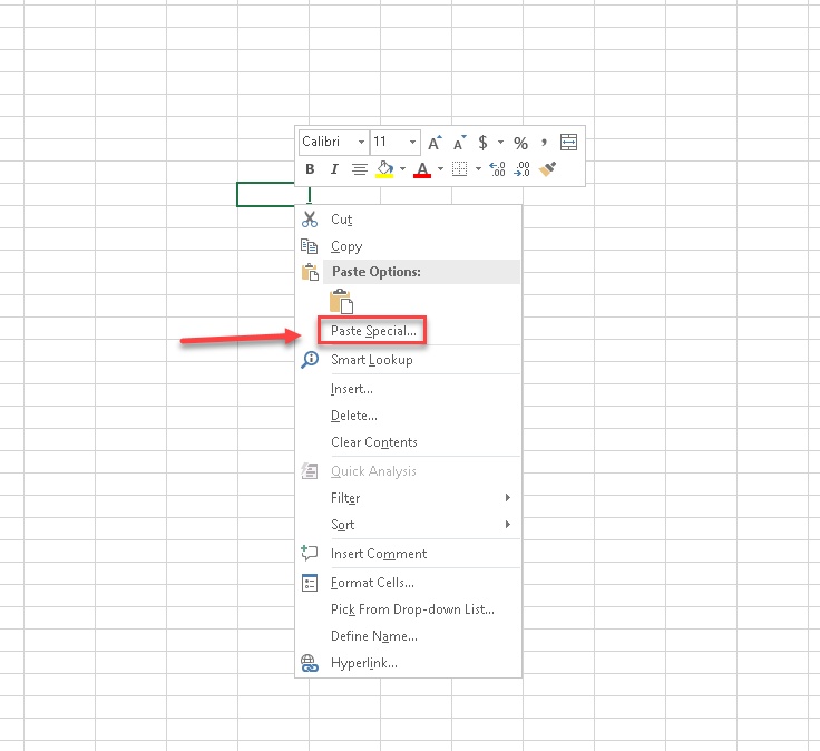 c. Open a new document in Microsoft Excel, right click on any cell and select ‘Paste Special’ .