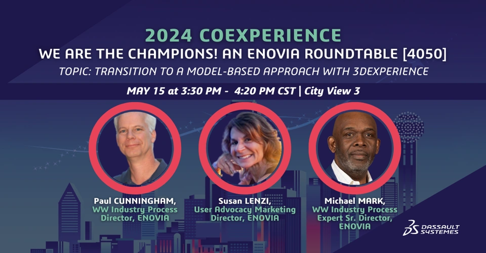 Join us at COExperience for the We Are the Champions! An ENOVIA Roundtable [4050] with @SL, @PC, and @MM.