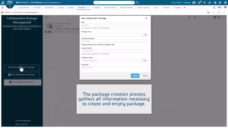 The 3DEXPERIENCE platform supports the creation and management of these Technical Data Packages through Collaborative Package Management app, available in the role “3D Product Architect (PAU)”. This app governs the process of gathering and protecting data to be exchanged with suppliers and partners and controls product data sharing with all involved stakeholders while managing the disclosure of sensitive data.